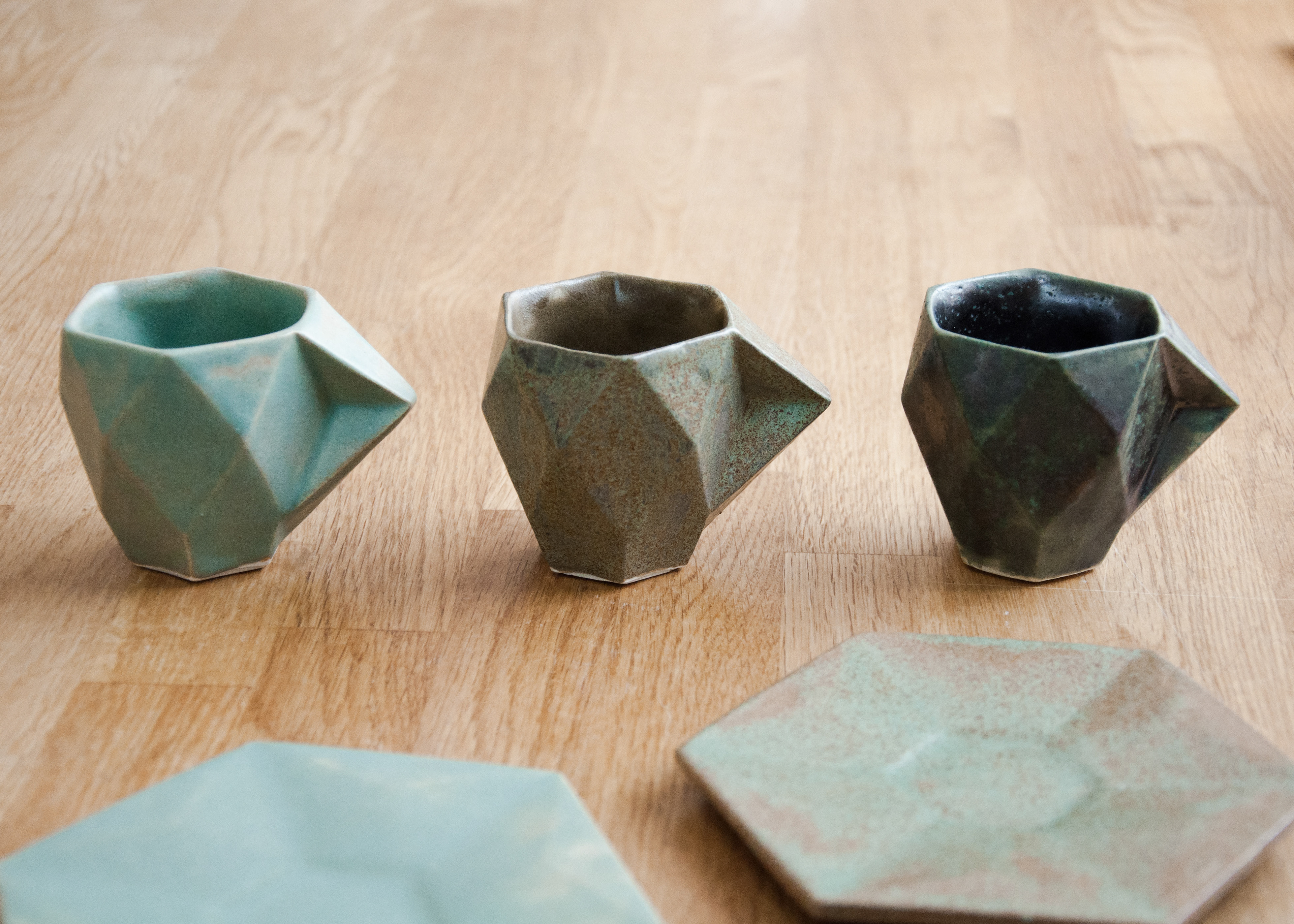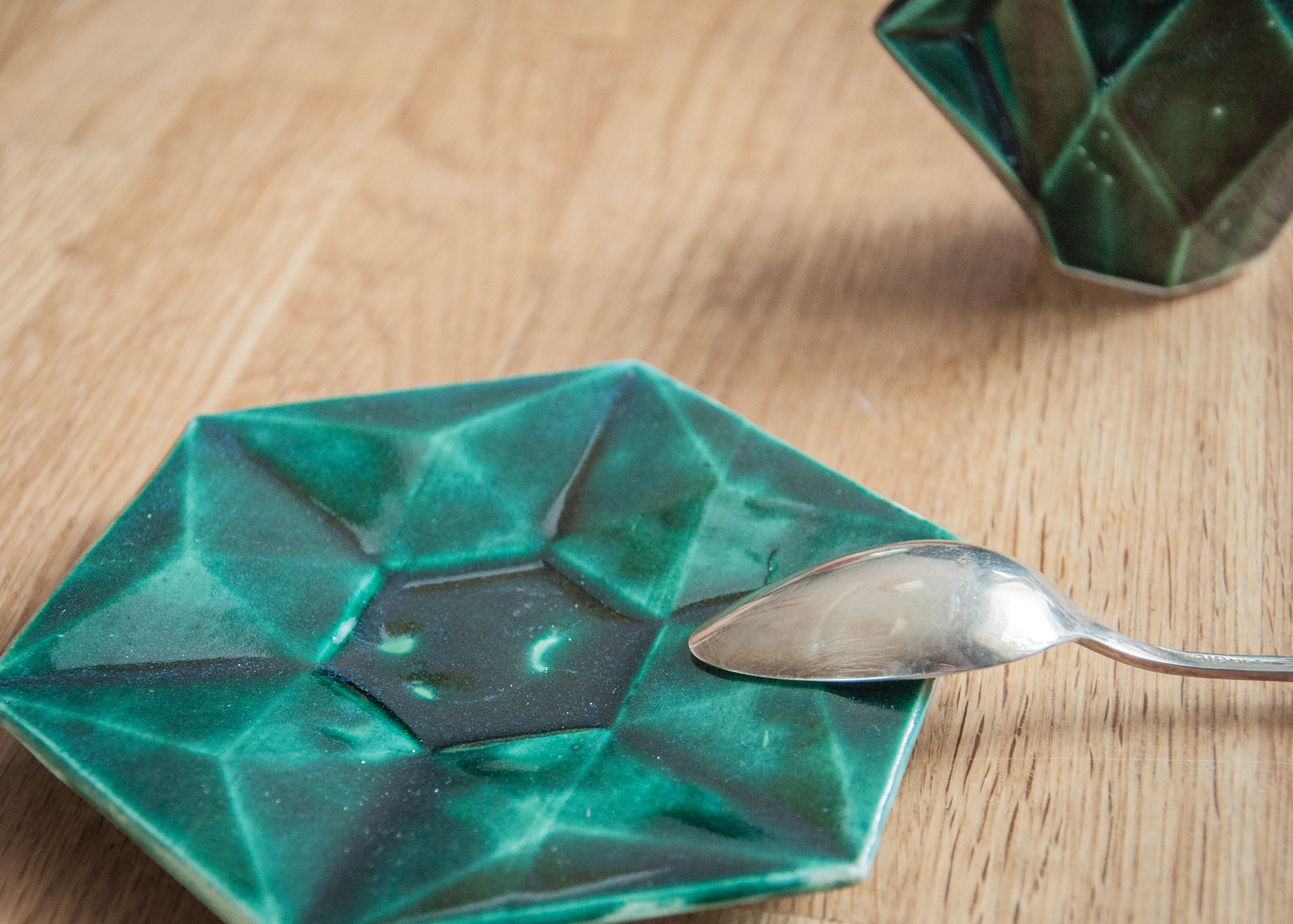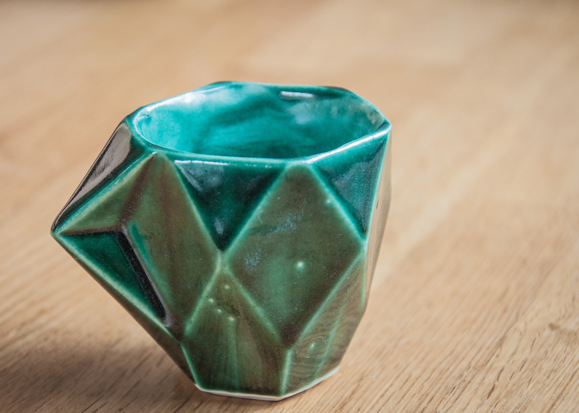 Oto kolejne próby z zielenią tym razem szmaragdową, ciemną i głęboką. To szkliwo wyjątkowo dobrze podkreśla geometryczny kształt.