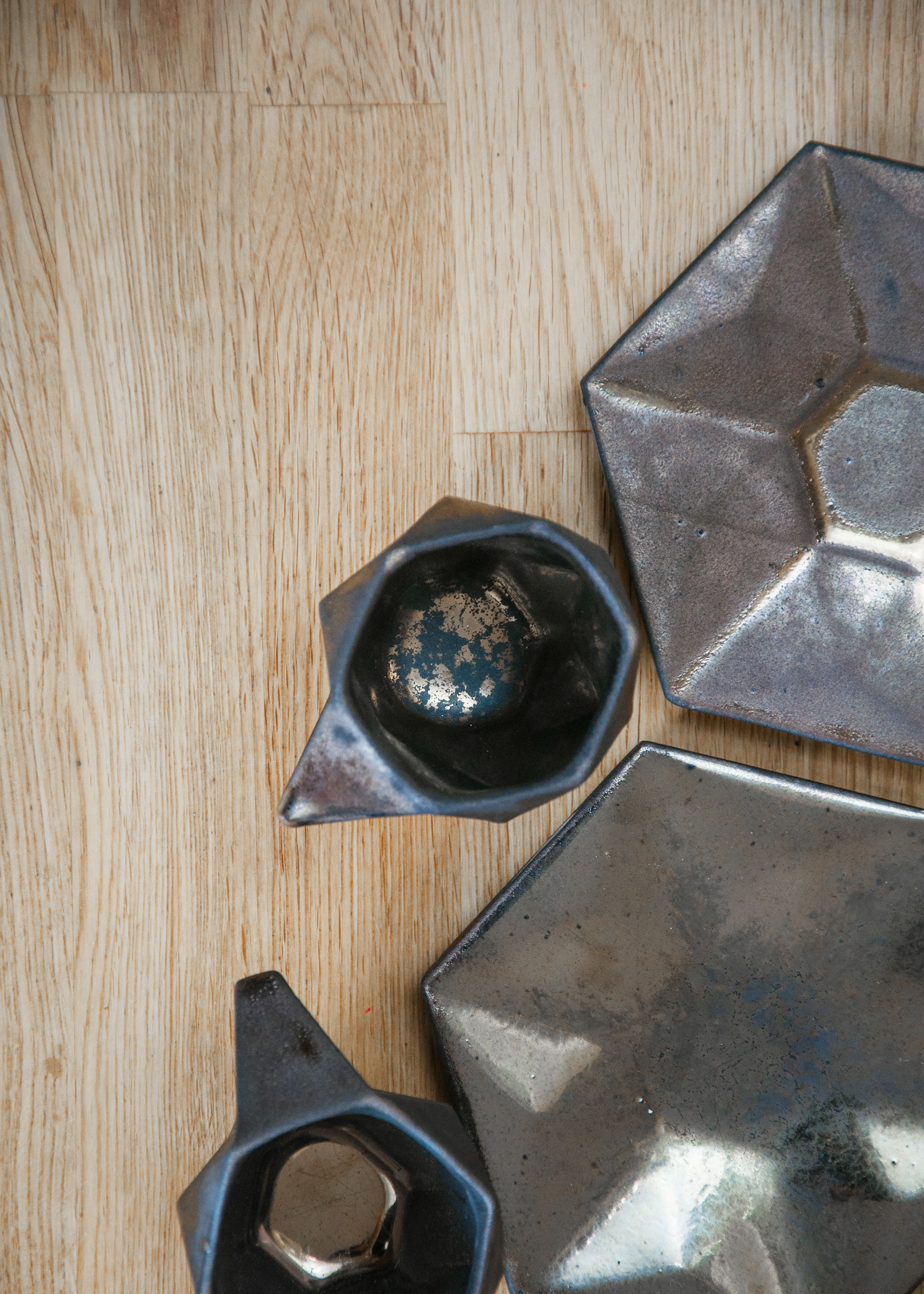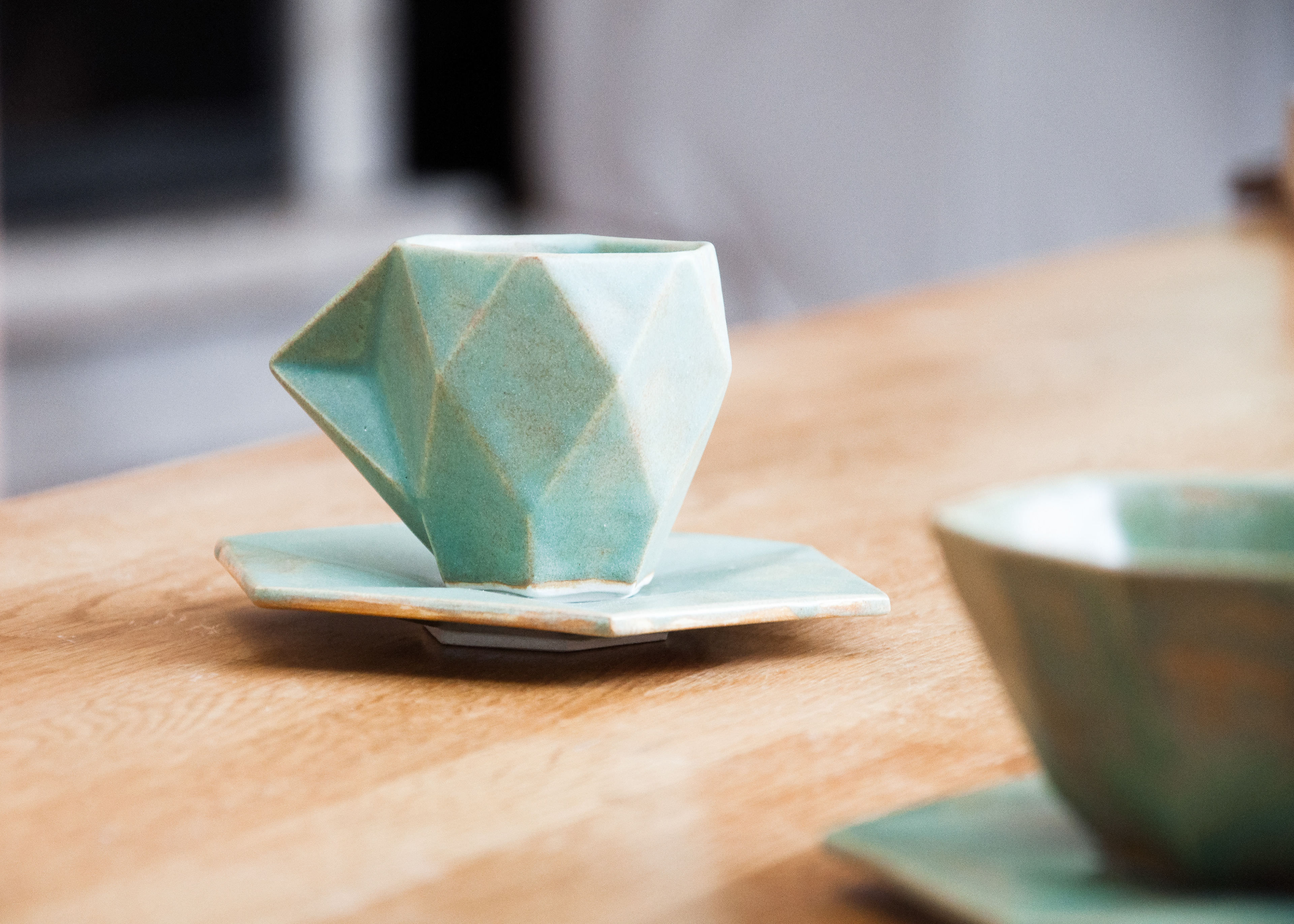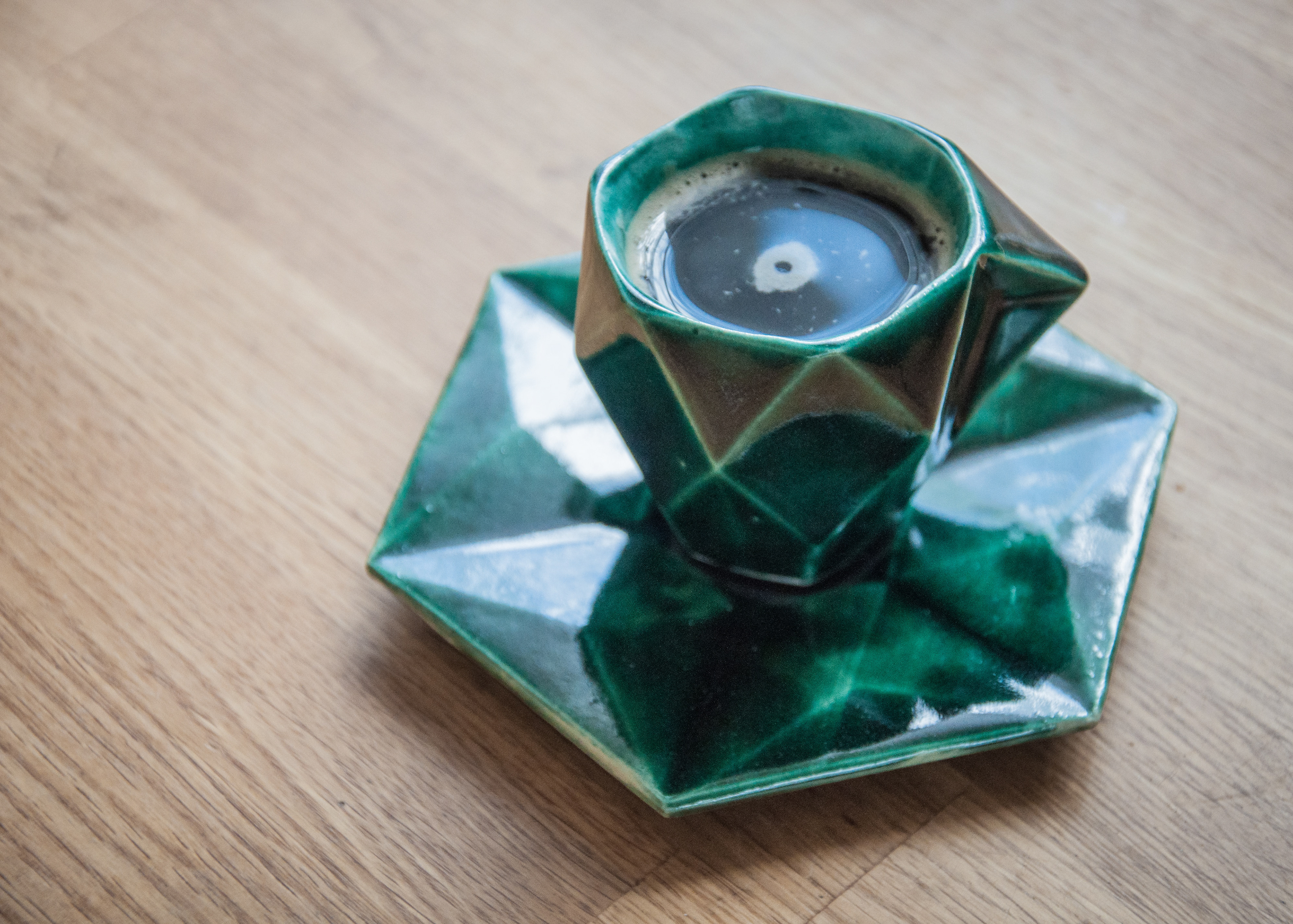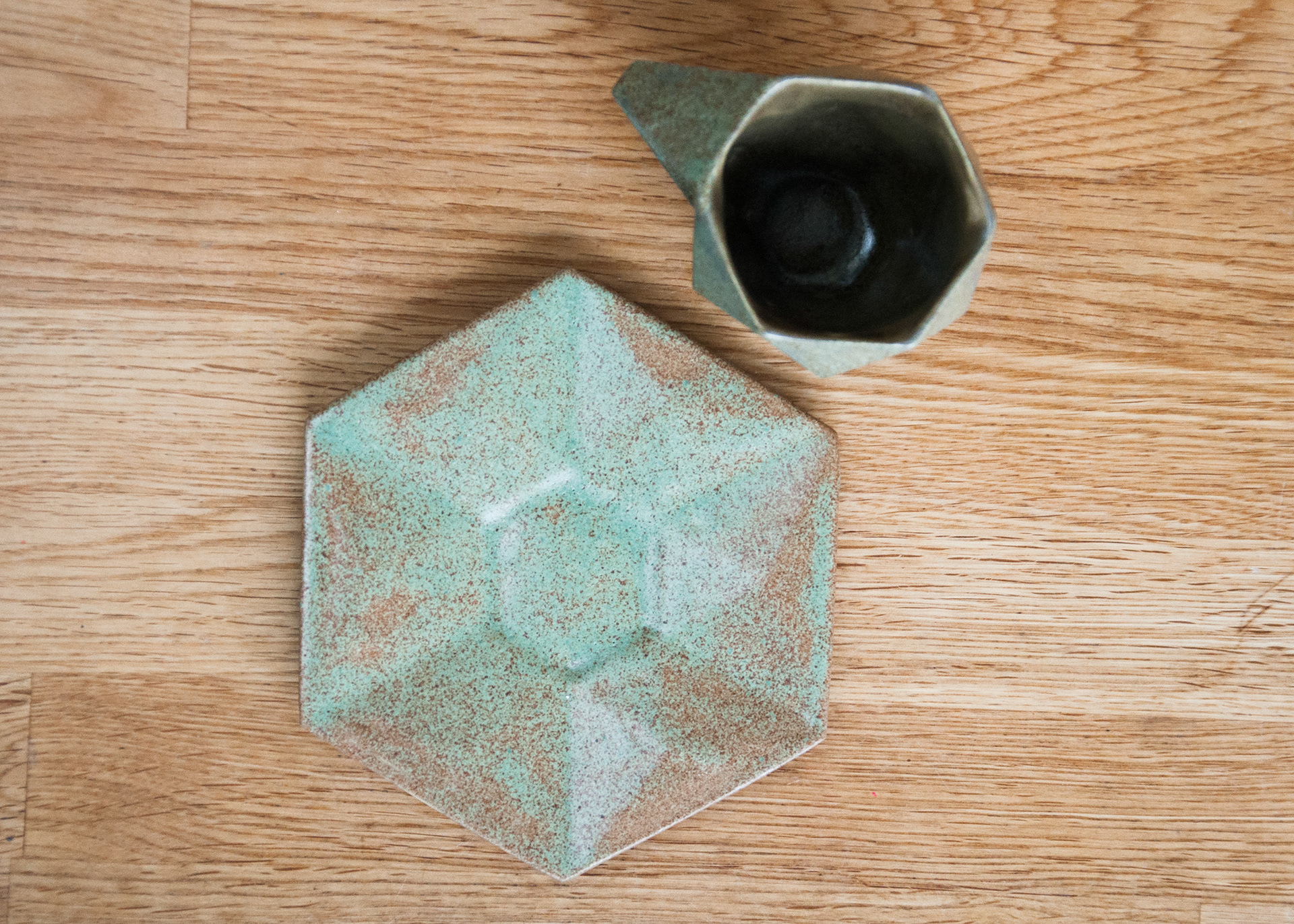 Oto kolejne próby z zielenią tym razem szmaragdową, ciemną i głęboką. To szkliwo wyjątkowo dobrze podkreśla geometryczny kształt.