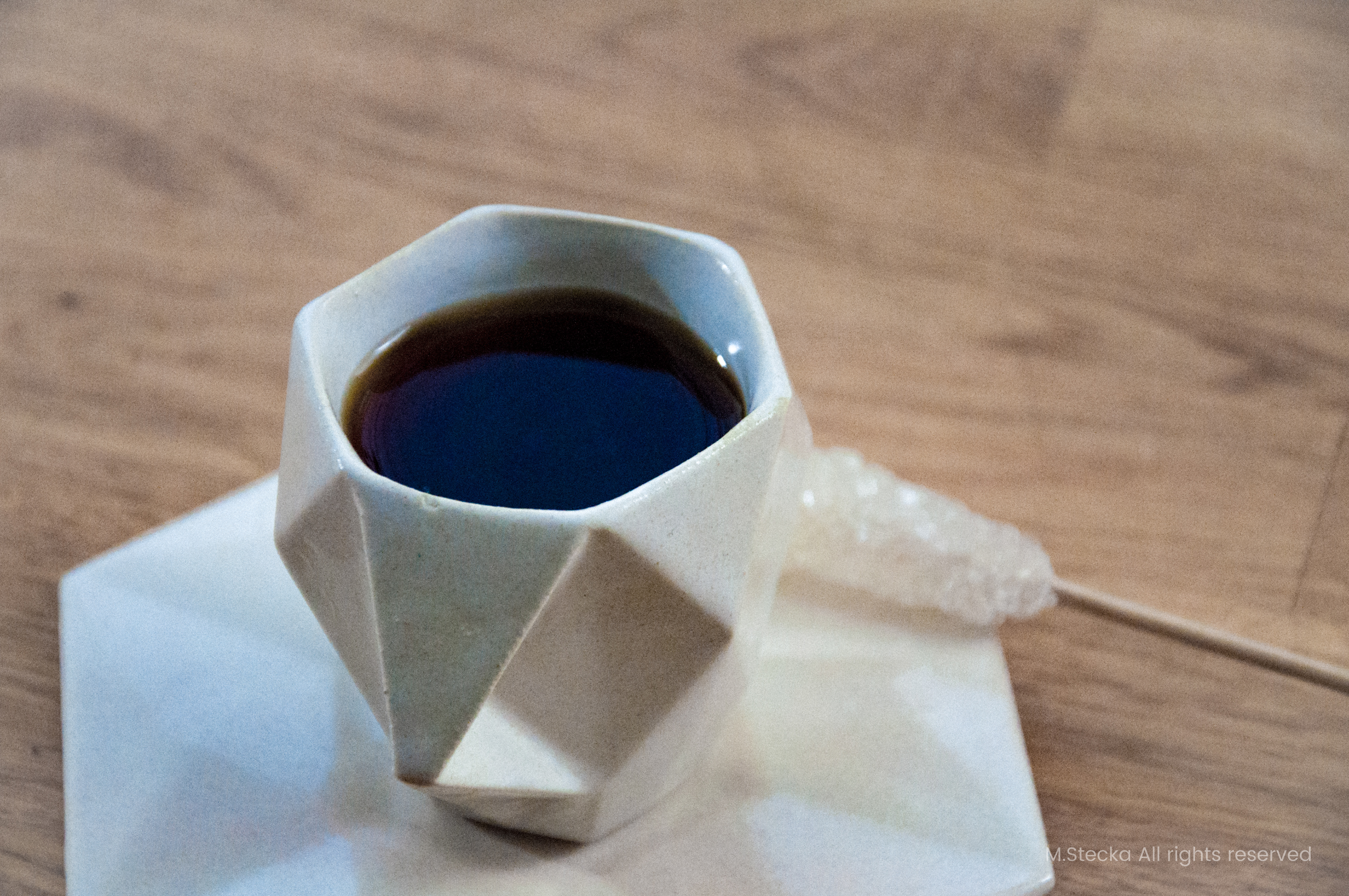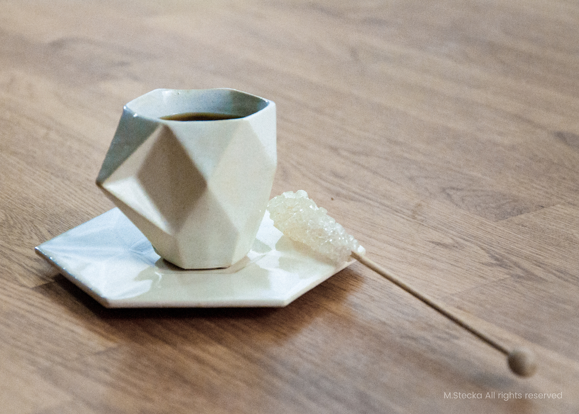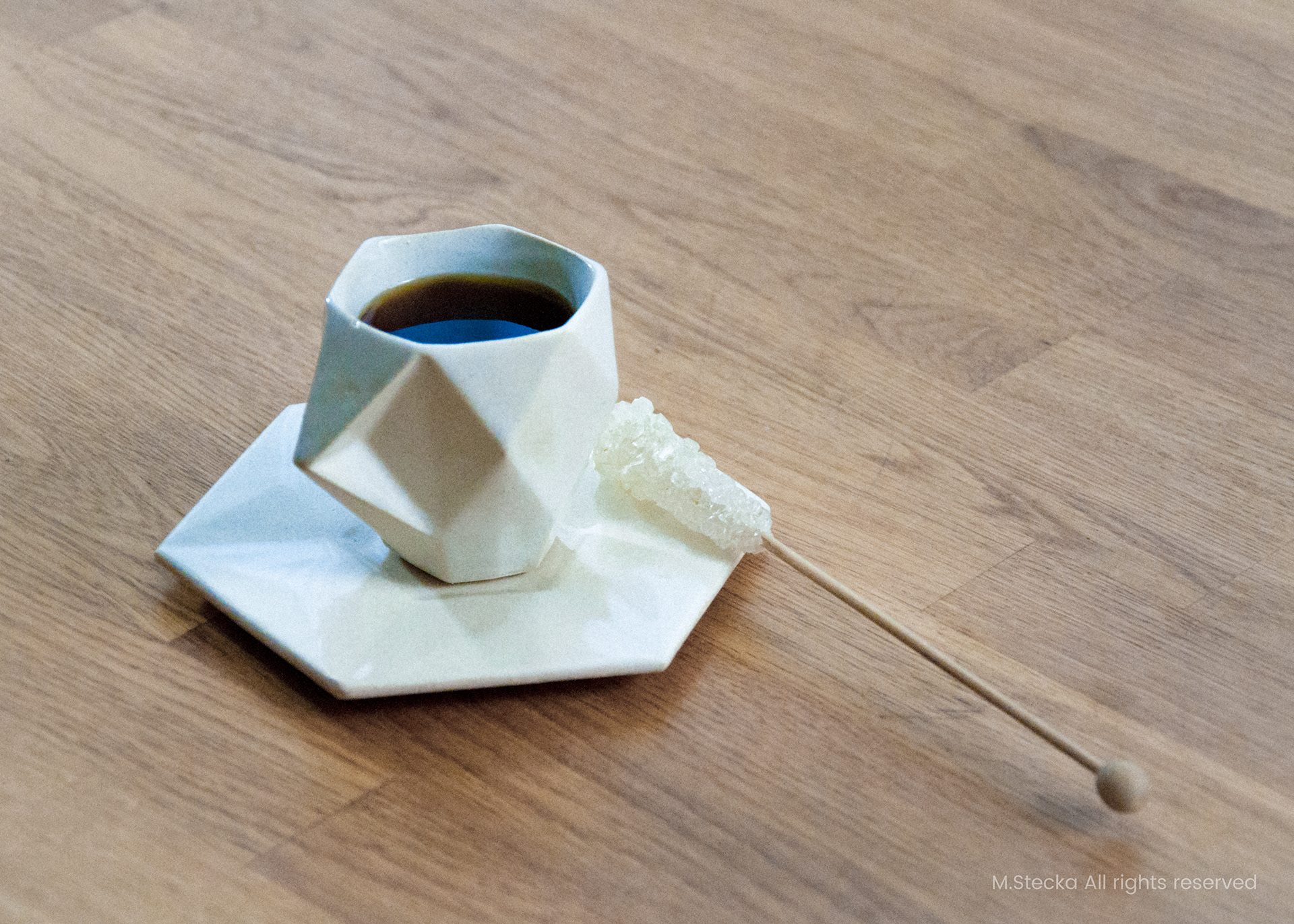 Jedyna jak do tej pory jasna wersja tej filiżanki ale nie banalna. Na zbliżeniu widać marmurkowy wzór szkliwa.