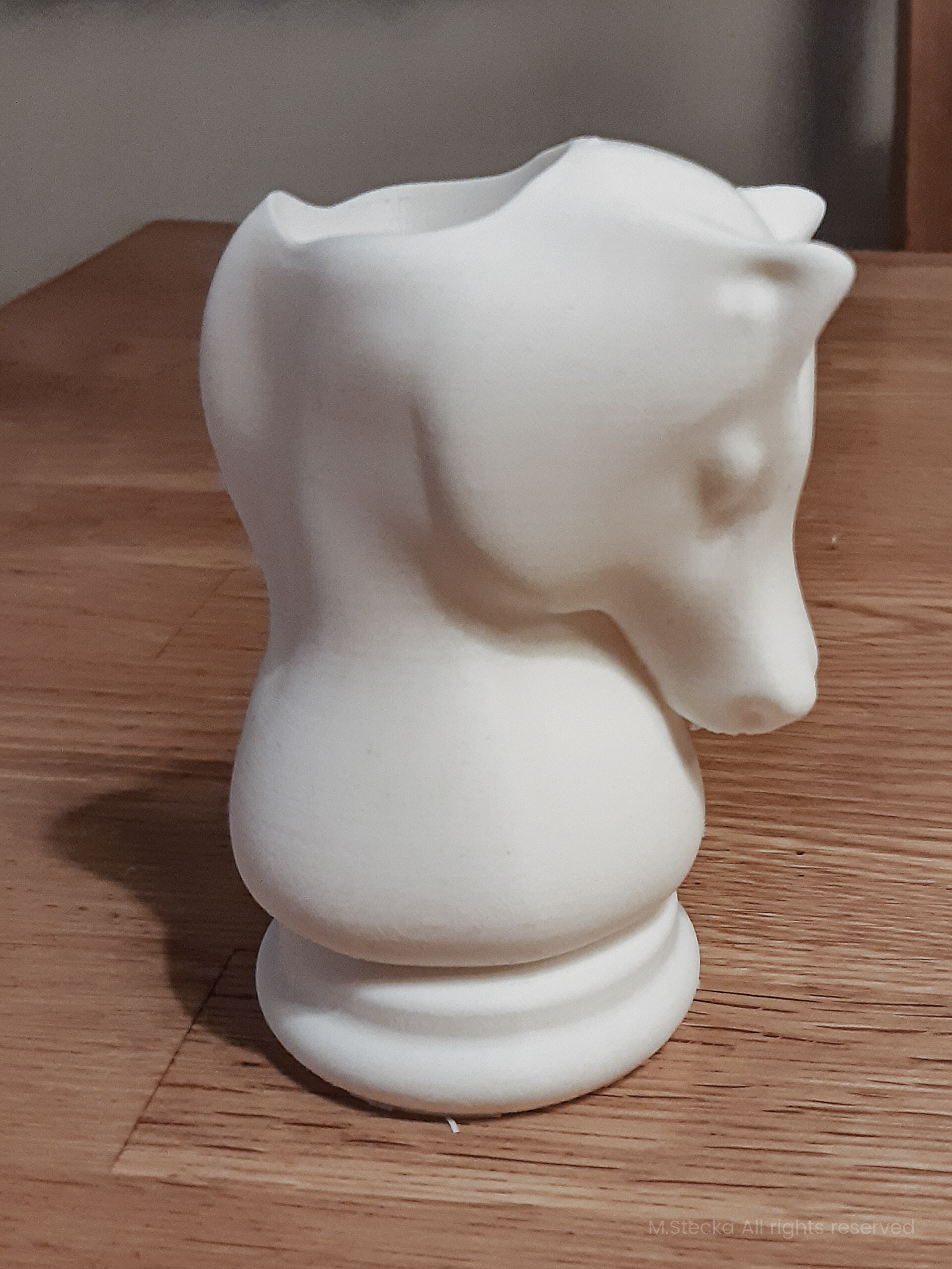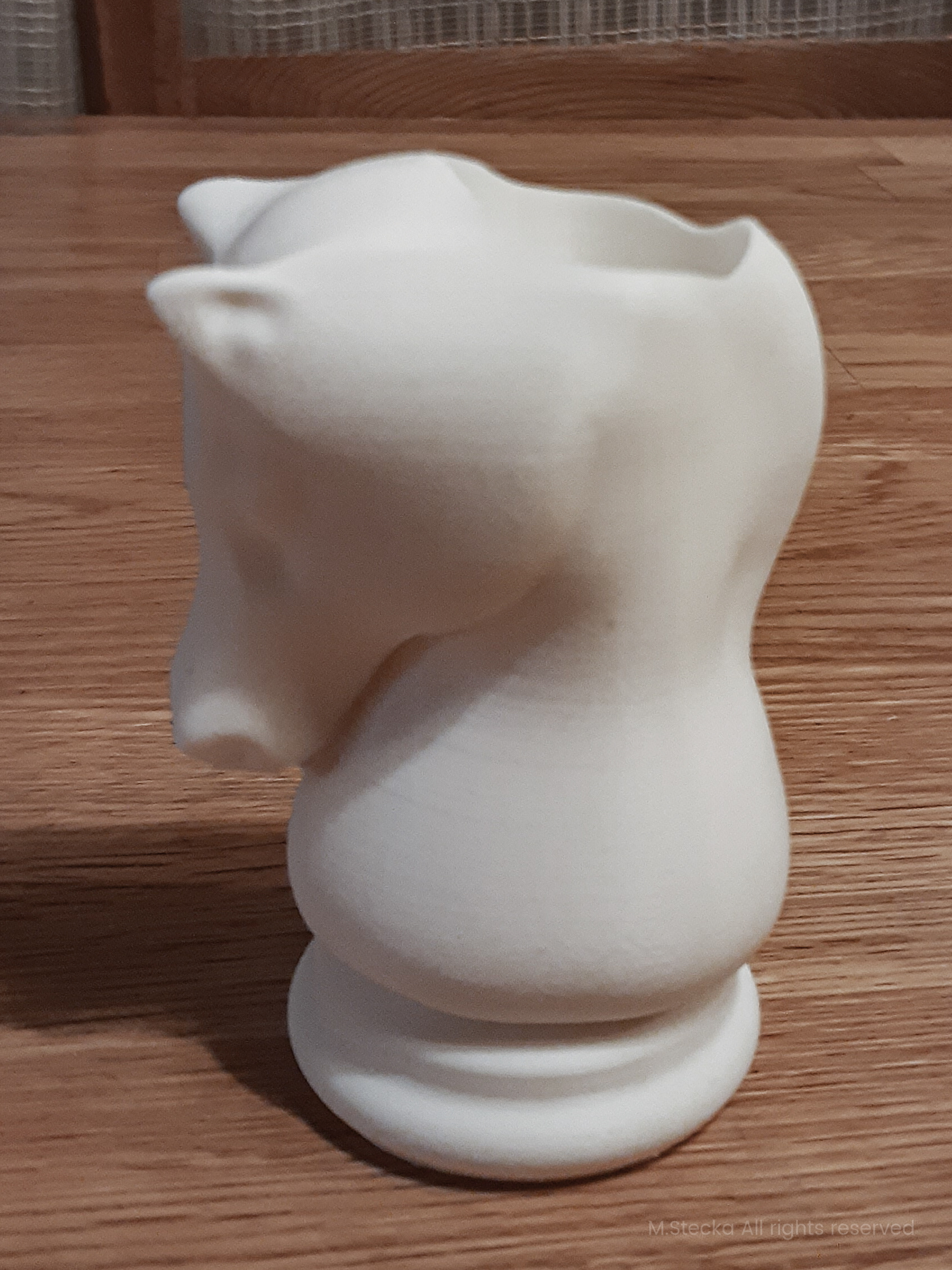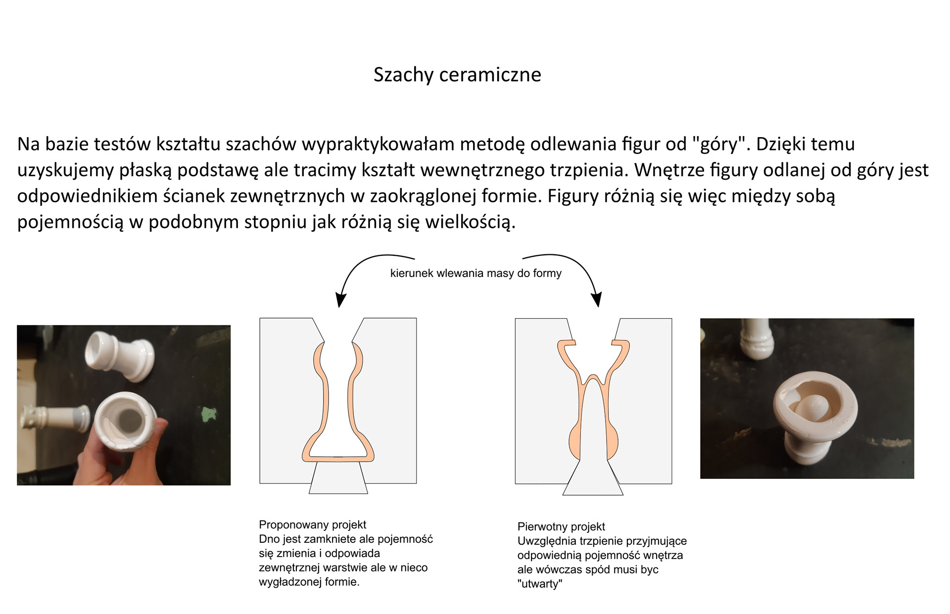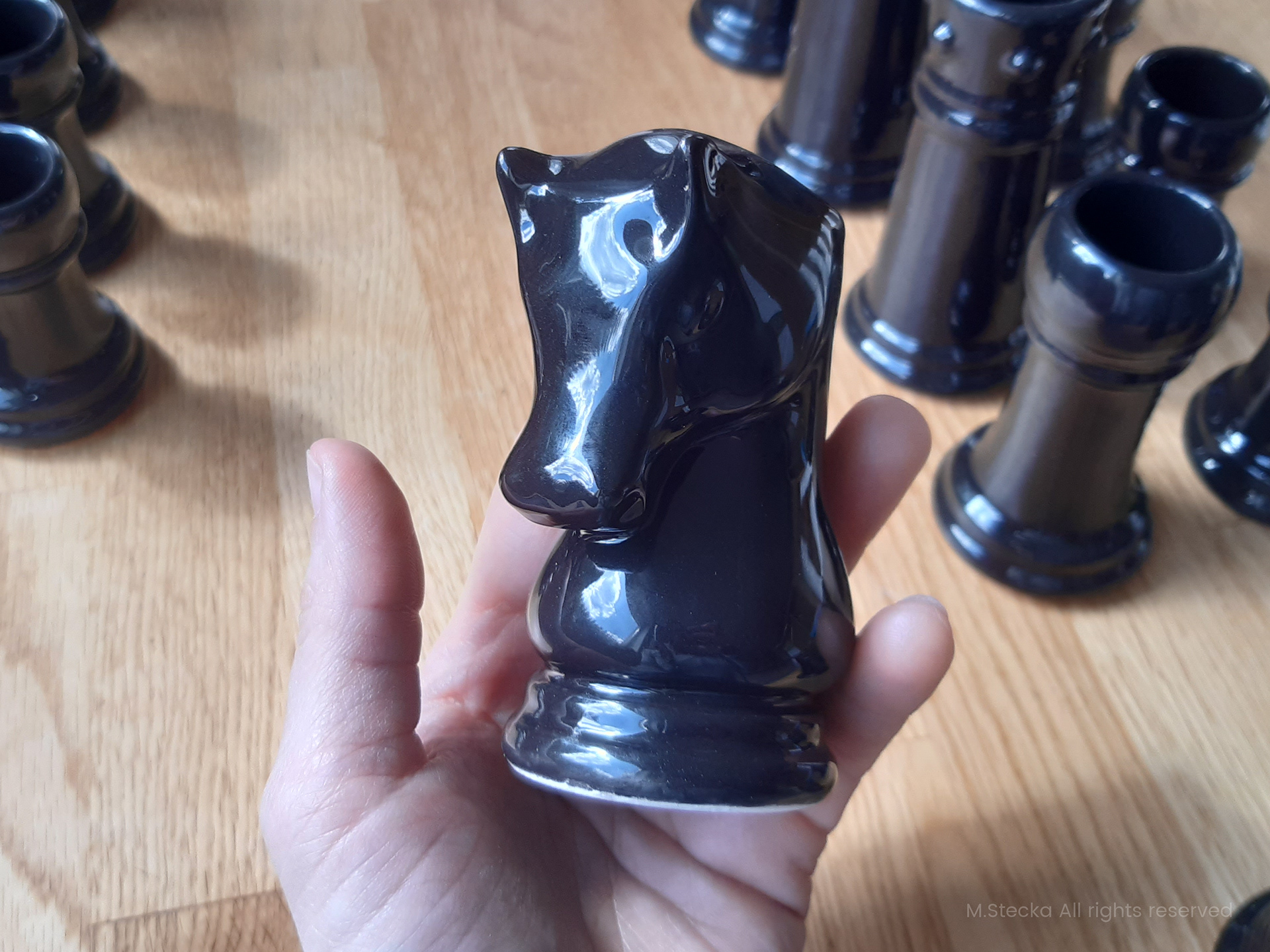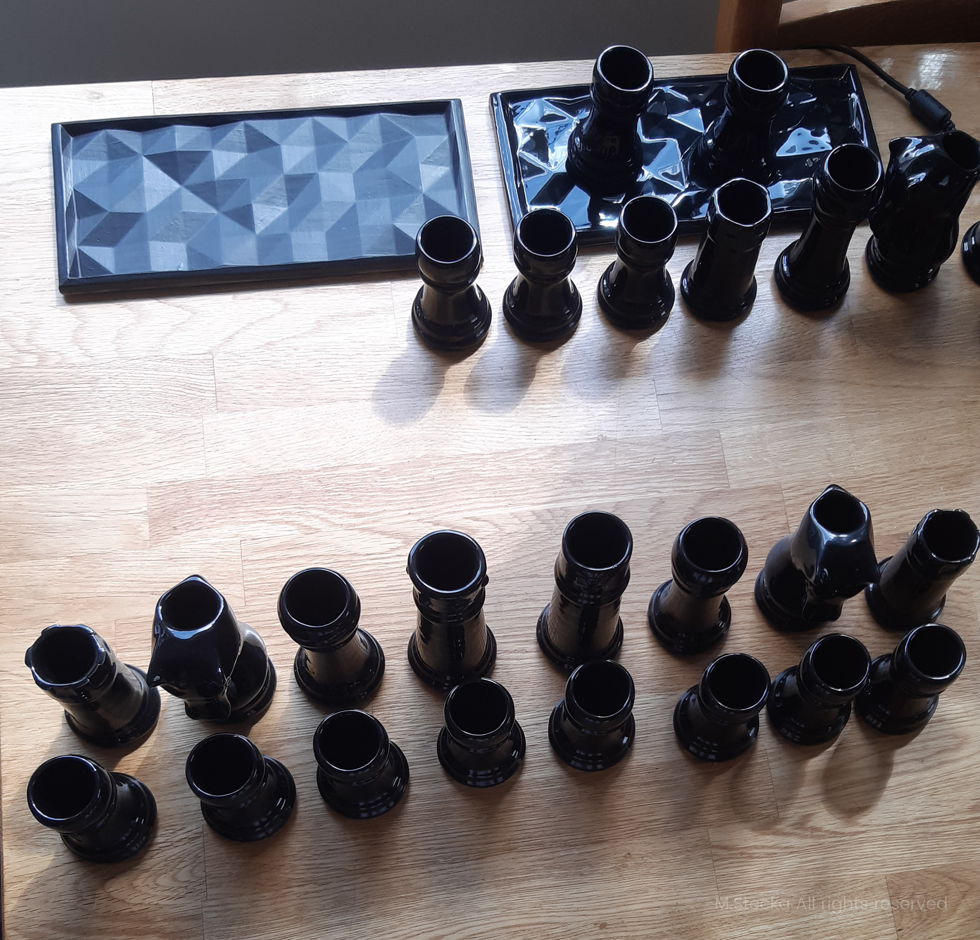 Projekt łączący modelowanie, druk3D i ceramikę. W każdej z tych dziedzin stawiał wyzwania! Model musiał być ustawiony tak by wnętrze( kieliszek w figurze) był jak najbardziej schowany. Wydrukowana figura musiała mieś nieskazitelne powierzchnie co wymagała dużej dokładności druku i specjalnego materiału do wygładzenia. Nareszcie forma do odlewu ceramiki była najbardziej złożoną formą jaką kiedykolwiek zrobiłam- miała 5 elementów by powierzchnie nie kolidowały przy otwieraniu. Kieliszek musiał mieć wylewany trzpień by pomieścić odpowiednią ilość napoju spożywanego podczas gry. Finalnie błyszczące szkliwienie nadaje klasyczny charakter.