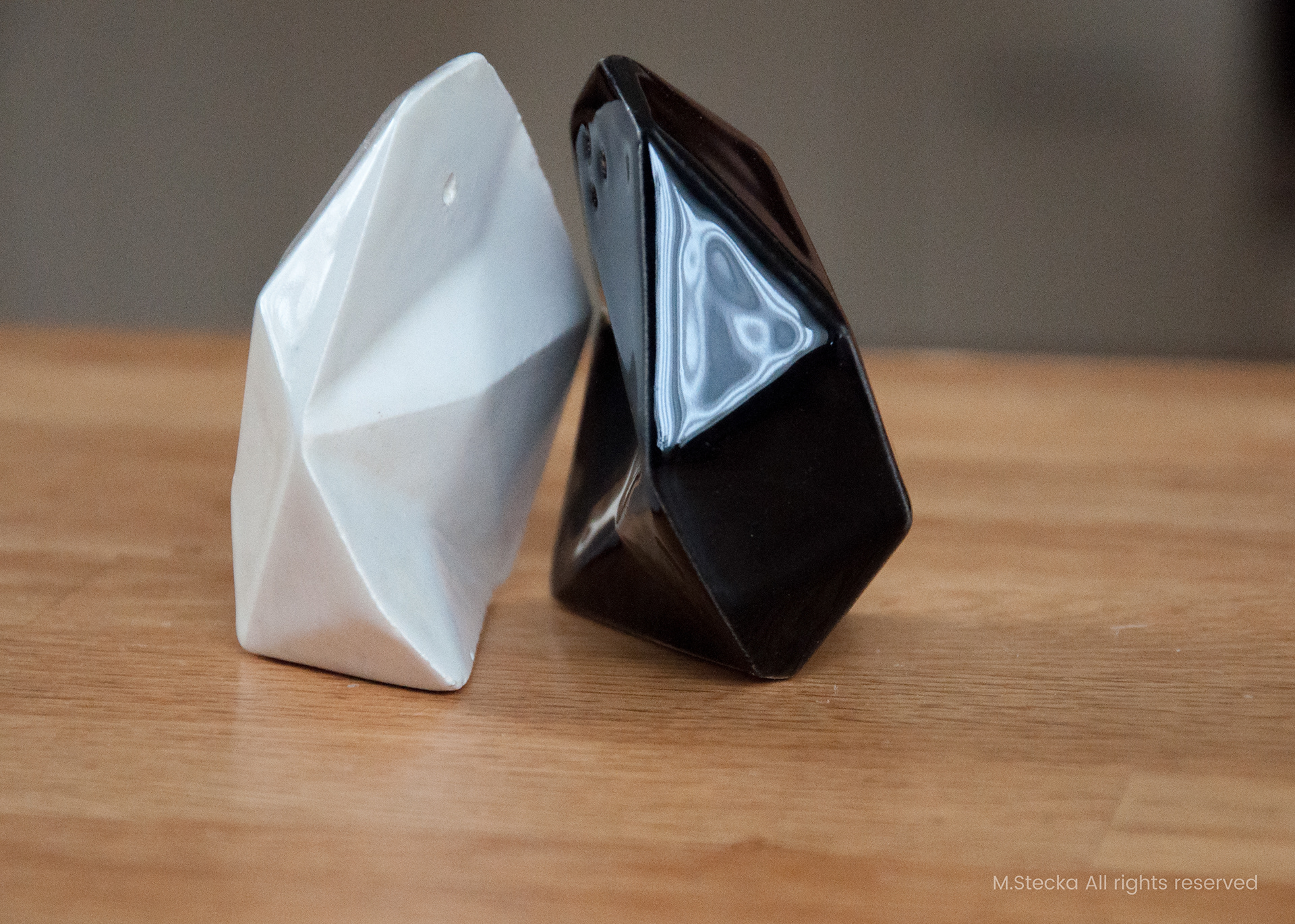Projekt solniczki i pieprzniczki są zestawem dwóch elementów, które łącza się ze sobą tworząc jednolitą bryłę. Złożone mają wygląd jednolitej, nowoczesnej formy nie zdradzającej zastosowania. Korek zamocowany na stałe umożliwia wsypanie przyprawy bez potrzeby otwierani. Rozłączone ujawniają otworki do przyprawiania posiłków. Przyprawniki mogą oczywiście zawierać inne ulubione przyprawy jak np. curry lub chilli. Wówczas przyprawniki mogą być szkliwione na inne, odpowiadające zastosowaniu, kolory.